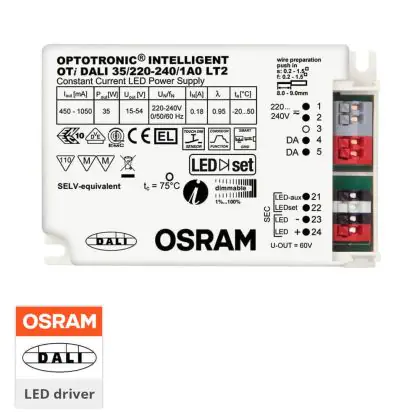 This Osram driver can also be connected to DALI systems. DALI is an international standard that allows multiple lights to be monitored and controlled from a central interface. DALI can be used to (automatically) perform actions like switching lights on and off or dimming them, for instance.